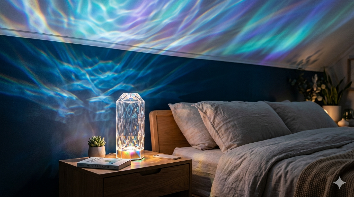 O Diferencial: Diferente de abajures comuns, ela cria um movimento fluído nas paredes que simula o oceano ou a aurora boreal.