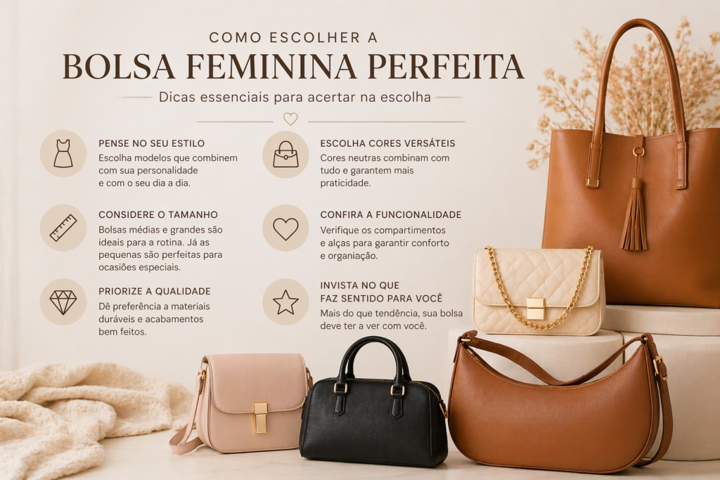 Escolher a bolsa feminina ideal vai muito além da beleza. É importante considerar o seu estilo de vida, as ocasiões em que a peça será usada e a praticidade no dia a dia.