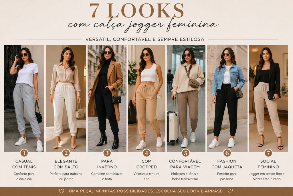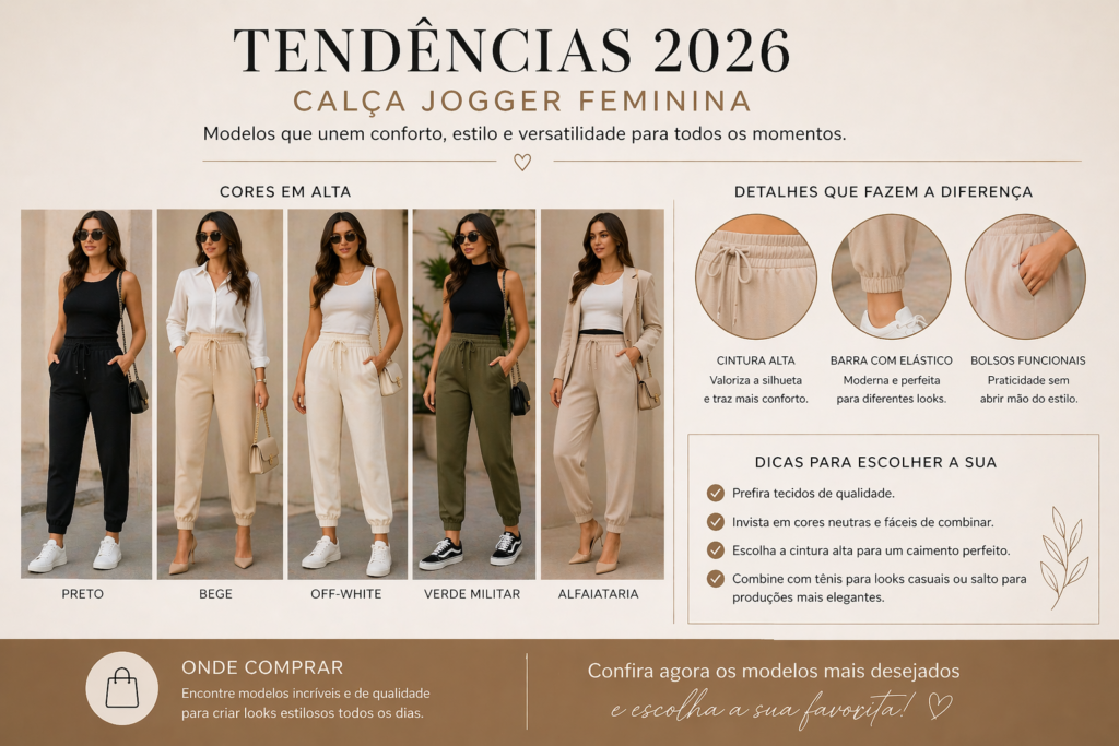 Com modelos em tecidos variados, cores modernas e opções que valorizam a silhueta, a jogger continua como uma forte tendência da moda feminina. Investir nessa peça é apostar em praticidade sem abrir mão da elegância.