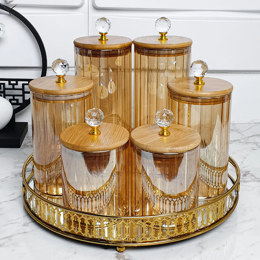 Temperos espalhados pela bancada criam “poluição visual”. Um organizador giratório (Lazy Susan) ou um kit de potes de vidro com etiquetas minimalistas deixa tudo à mão enquanto decora o ambiente.