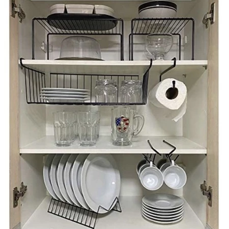 Seus armários parecem cheios, mas têm muito espaço “vazio” no topo? As prateleiras aramadas criam novos níveis, permitindo que você organize pratos, xícaras e mantimentos sem precisar empilhar tudo.