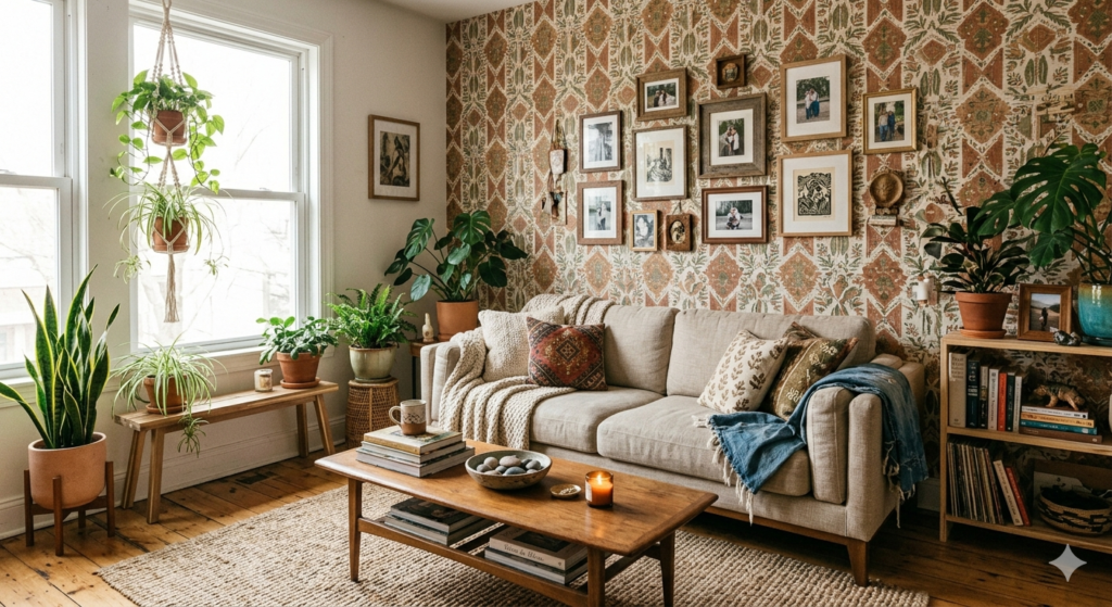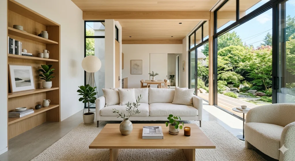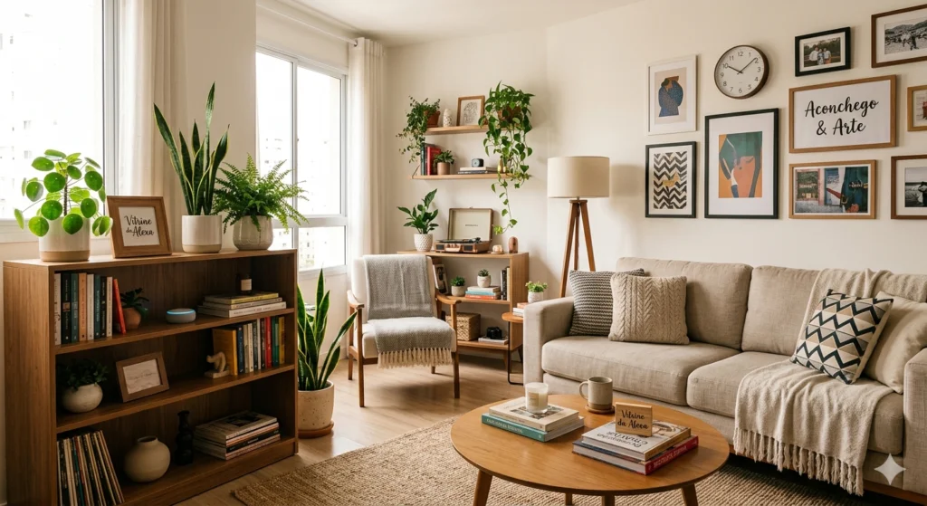 Harmonia Visual: Uma paleta de cores coerente e o uso de texturas (como almofadas e tapetes) ajudam a criar um ambiente que parece “curado” e não apenas arrumado.